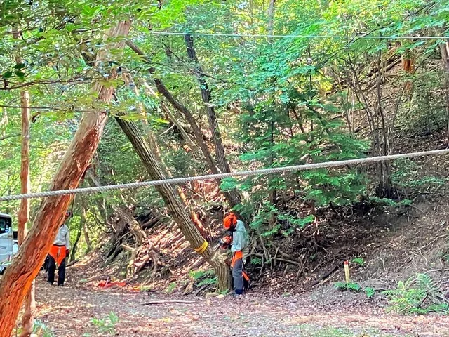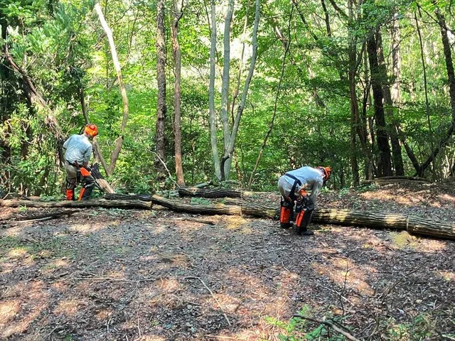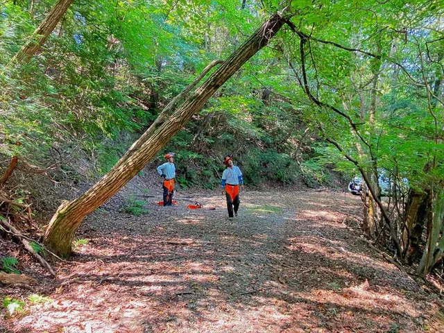 午前中は、第2管理道の危険木や枯死木の伐採作業を行った。