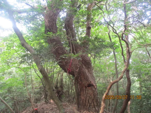 チェーンソーや道具を抱えながらの登山は大変で、途中で息が上がる場面もあったが、なんとか目的の赤松の枯死木に到着した。木には、東海自然歩道の管理者が巻いた赤いテープが付けられていた。すでに時刻は11時半を過ぎており、周囲の状況を調査しておおよその伐倒手順を検討した。