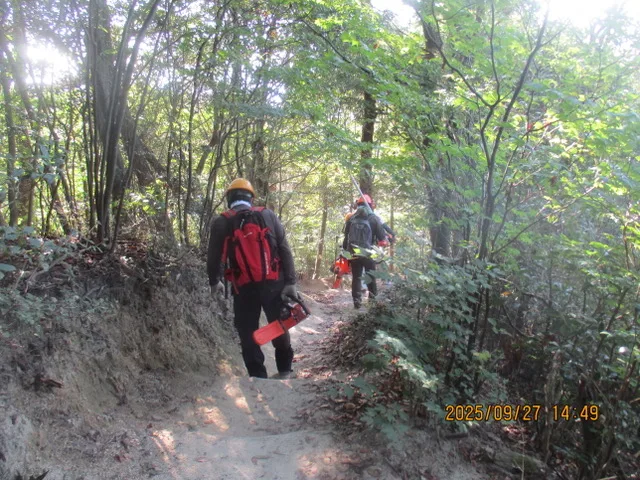 下山では、チェーンソーを肩にかけ、道具をリュックに入れてアップダウンのある下り坂を下り始めたが、途中から休み休みとなり遅れがちになった。休憩場所からは仲間にチェーンソーを持ってもらい、無事に三叉へ到着した。