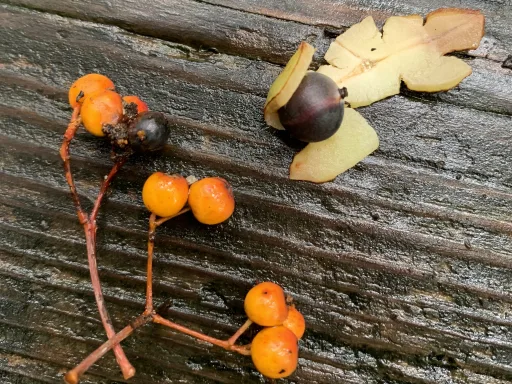 [木の実・草の種]:アオキ、アオハダ、ウリカエデ、オオウラジロノキ、コアジサイ、コナラ、サルナシ、シロダモ、シロモジ、ソヨゴ、ツクバネ、ツルアリドオシ、ナナカマド、フユイチゴ、ミズキ、ミヤコイバラ、ミヤマシキミ、ヤブコウジ、ヤブツバキ、ヤブムラサキ、ヤマウルシ、スルガテンナンショウ、チヂミザサ、ハイチゴザサ、ヒメジソ、ミズヒキ、ヨウシュヤマゴボウ等