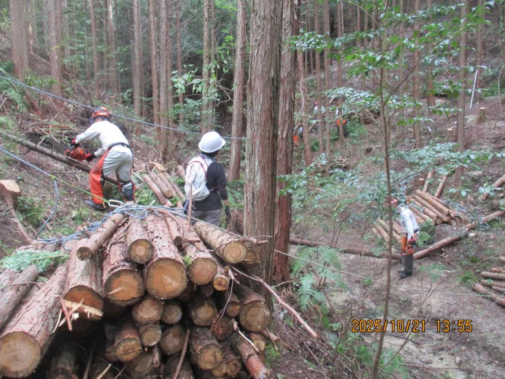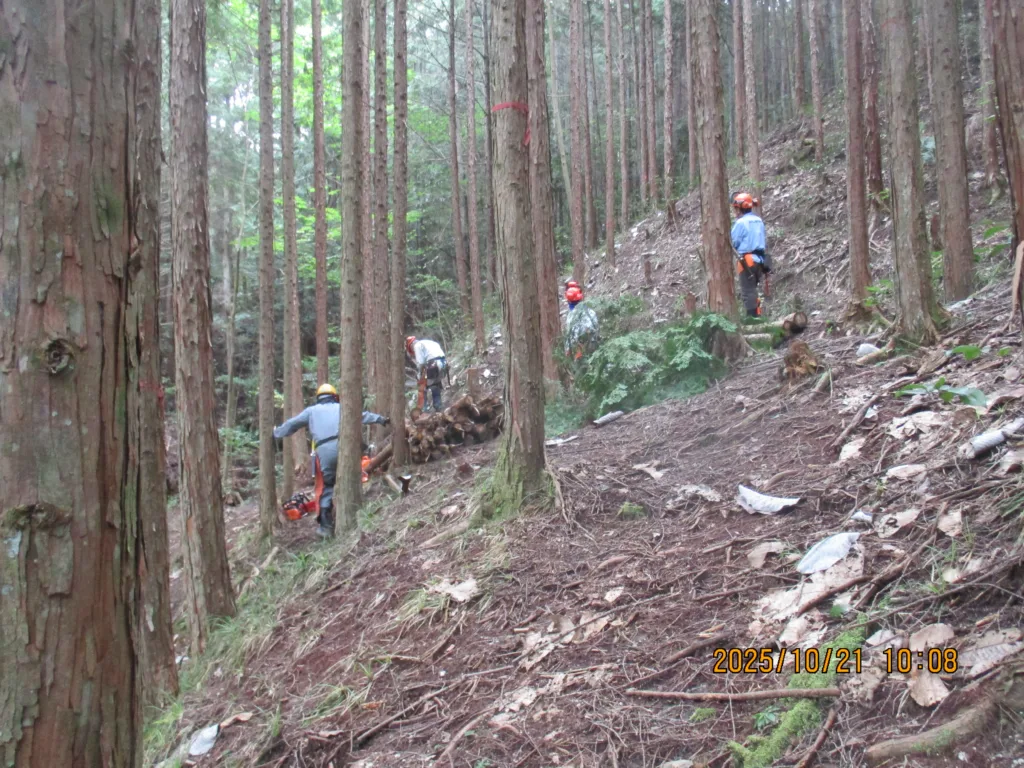 今回は谷側へ倒した木が多かったため枝払い玉切り作業は、斜面を登り降りする繰り返しとなり体力的には結構きつかった。