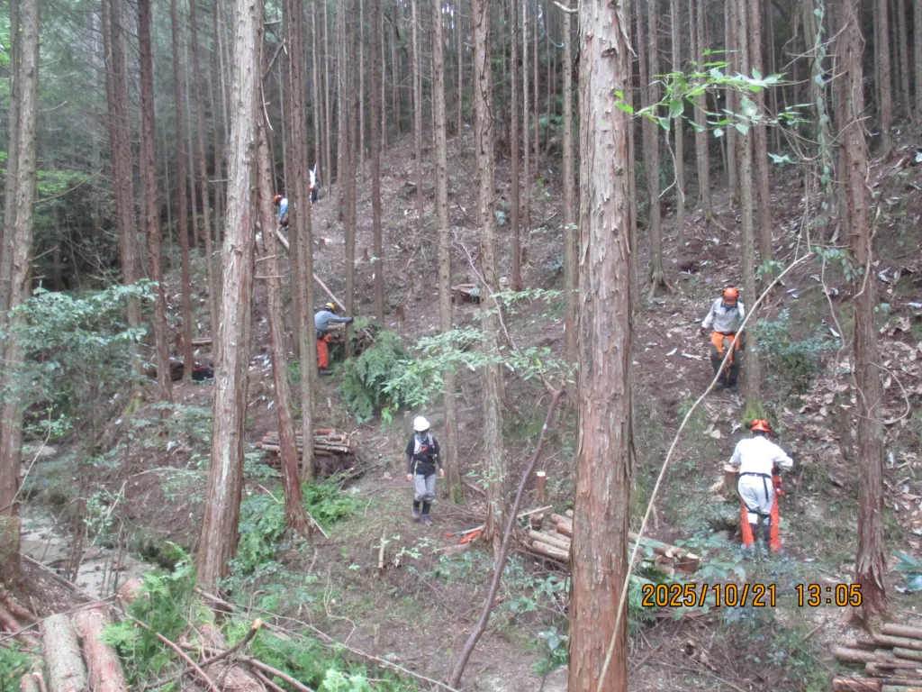 久しぶりの演習林活動だったが、声掛けなど安全面での配慮を行いながらヒヤリハットもなく無事作業を終了した。伐倒本数は34本。夏の猛暑も一段落、朝晩は涼しく秋めいた気候となり、作業をするには丁度よい活動日だった。