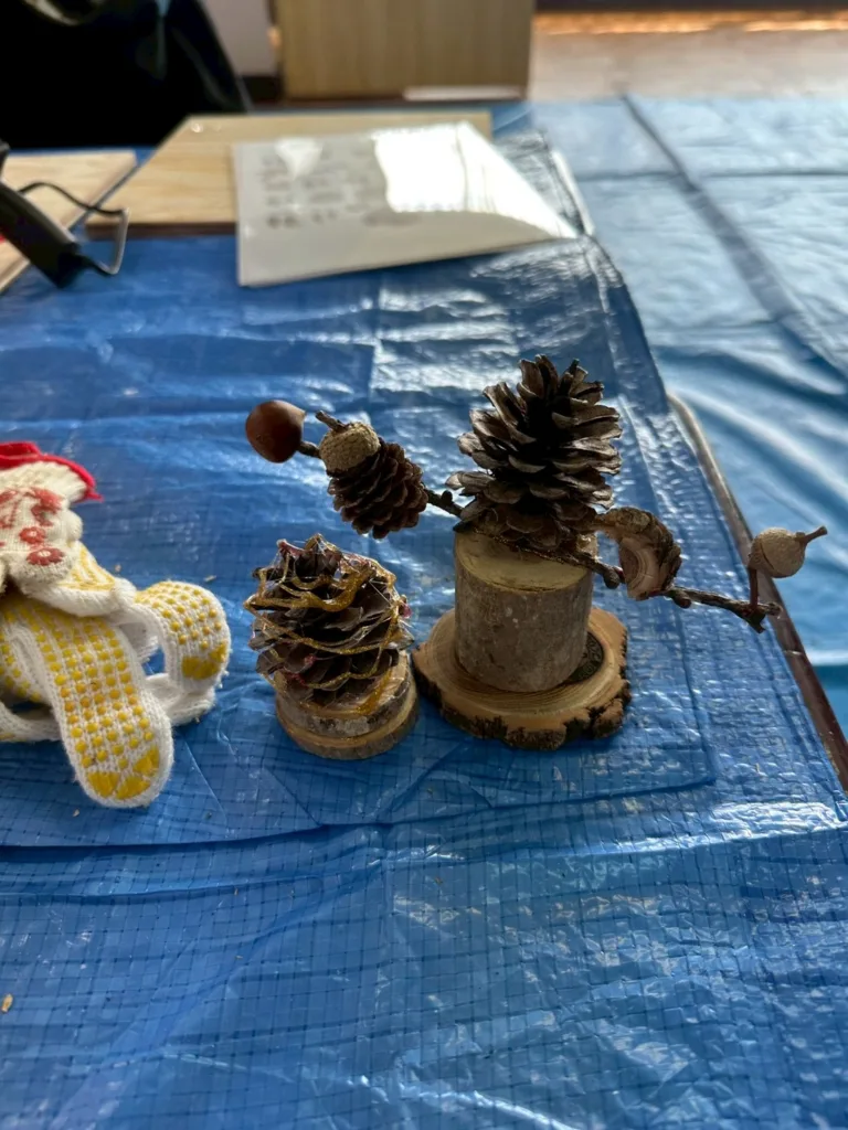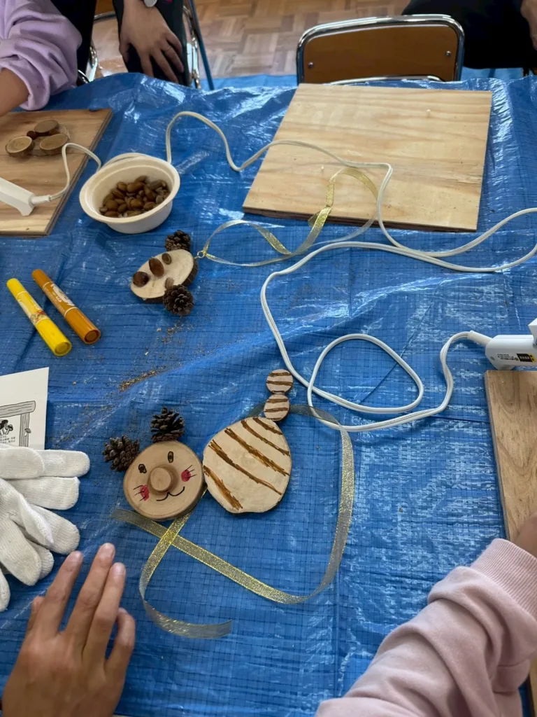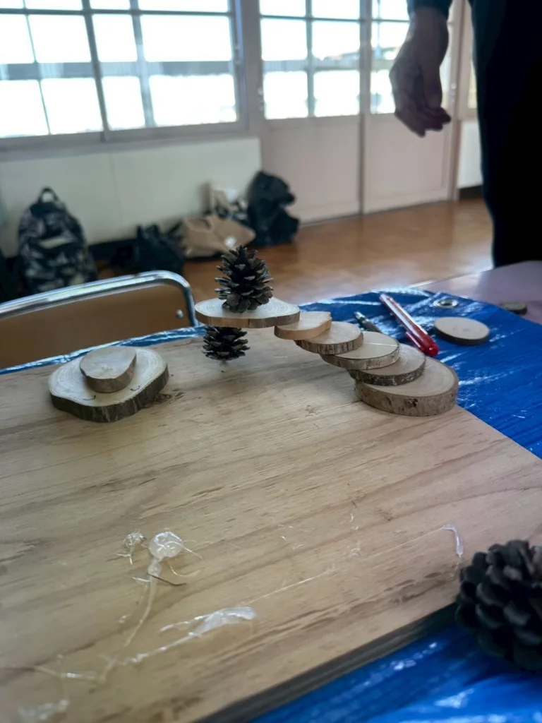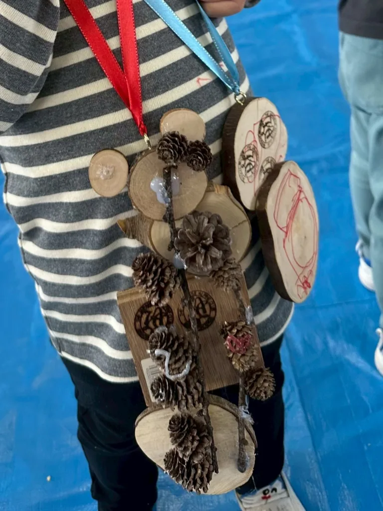 続いては自然のペンダントを作りました。木の枝を薄くにカットした物やドングリ、松ぼっくりを接着しリボンを付けて完成です。戸惑いながら思い思いの可愛いペンダントが誕生しました。時間も材料も余裕があったので次の作品に!園児が「こうしたい!」を保護者がサポート。その為、ペンダントを超えた大作があちらこちらで見られ、満足そうな笑顔が溢れていました。