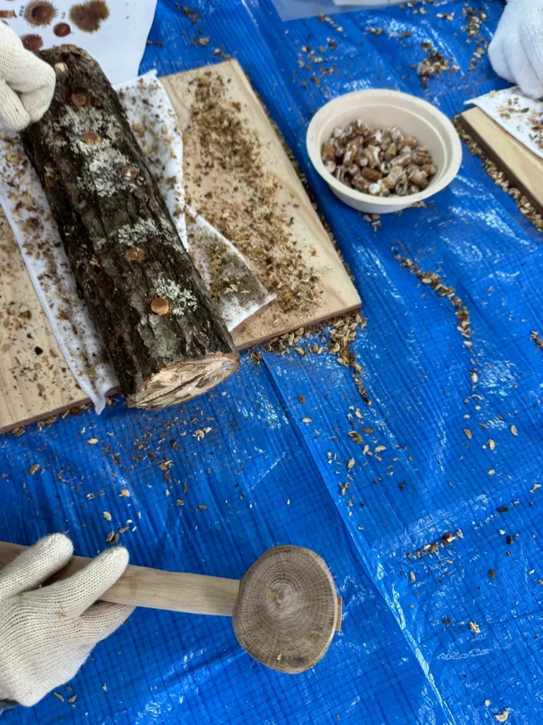 はじめにシイタケの菌打ちを行います。30センチほどのコナラの木にインパクトドライバーで穴をあけ、シイタケの菌を木槌で打ち込みます。シイタケは園児にとってあまり抵抗感なく、説明を聞き作業を開始。穴開けは保護者がメインとなり菌打ちは園児が担当。トントンと楽しそうな音が園内に。この木槌はスタッフの手作りで持ちやすく、お子様でも振りやすい重さに作られ、アンケートに木槌でトントンできたことが想い出なった園児の声も複数ありました。