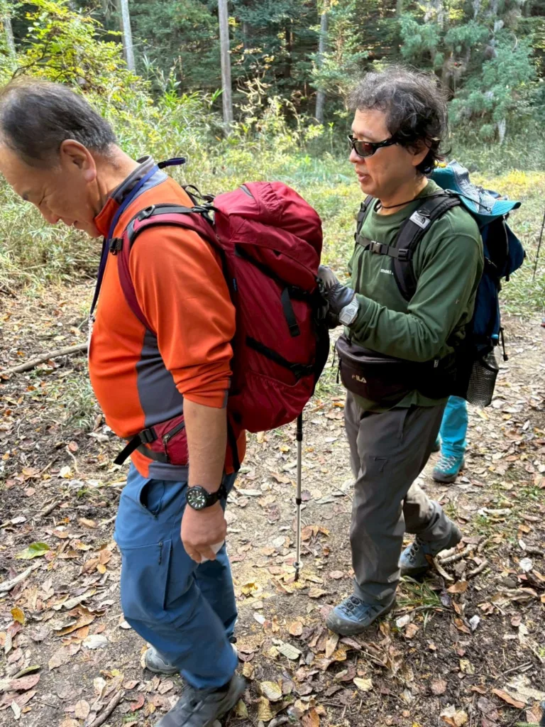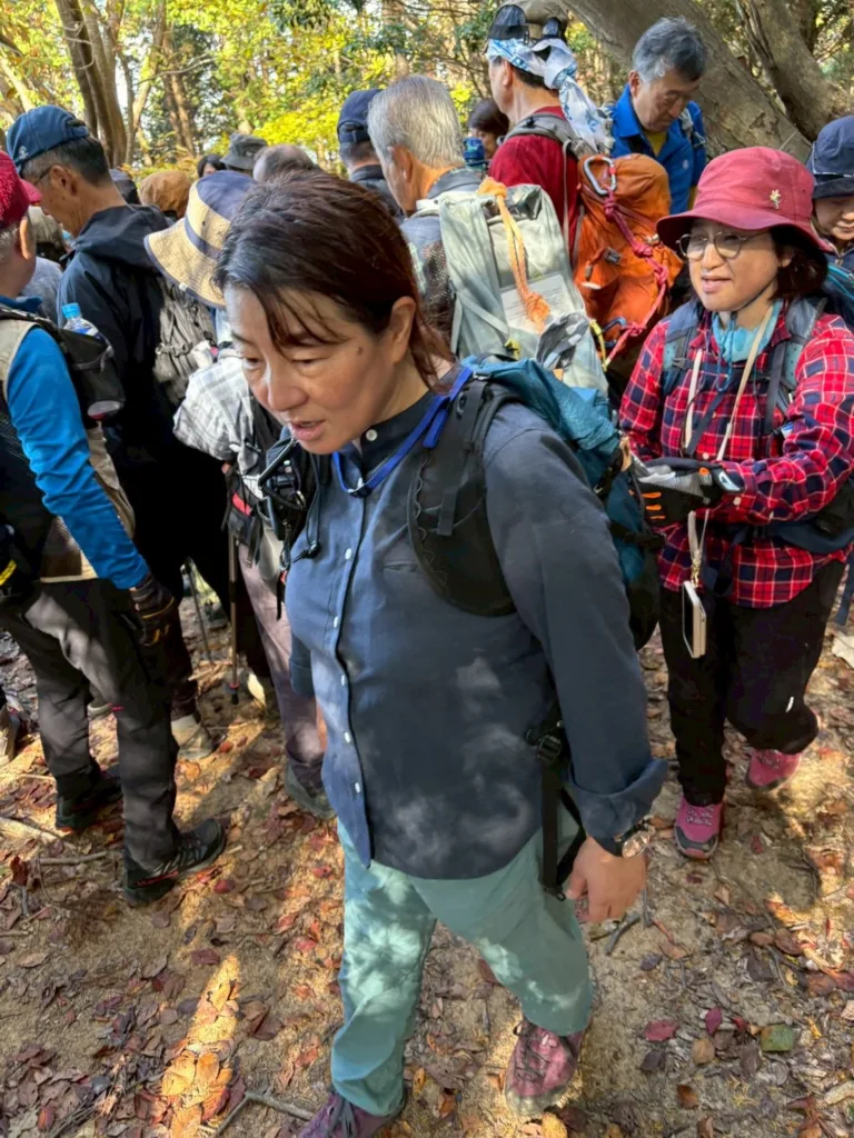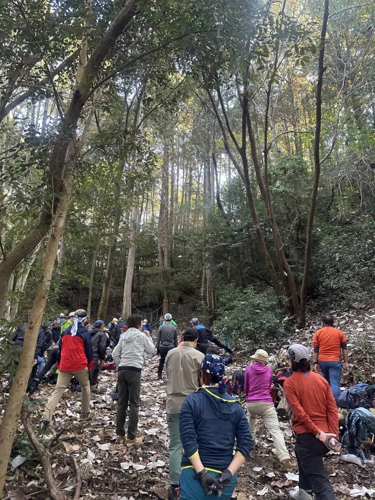 ここからは危険な場所はない為、ブラインドのサポート体験も楽しく行っていただけた。猿投山のやまじ小舎の手前でゴール。猪汁を提供してくださった猿投の森づくりの会代表の和田さんと猪を仕留めた税所さんをご紹介の後、東海支部高橋支部長〜尾上さん〜最後に柏副会長にご挨拶をしていただき、2日間の集会が終結。