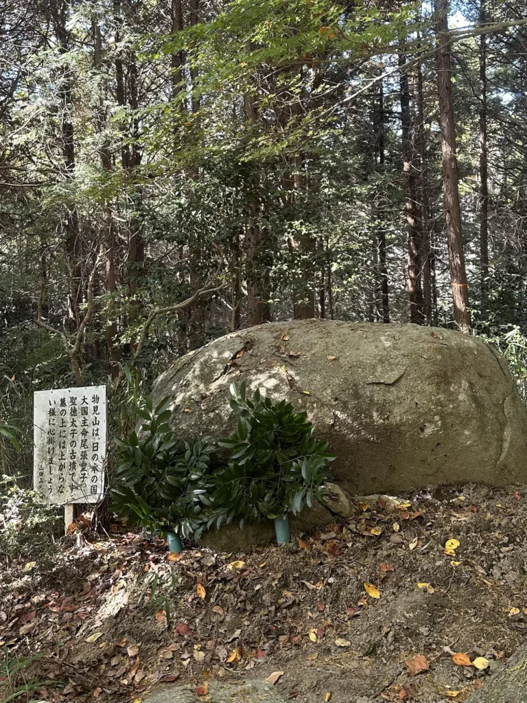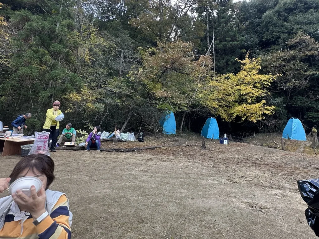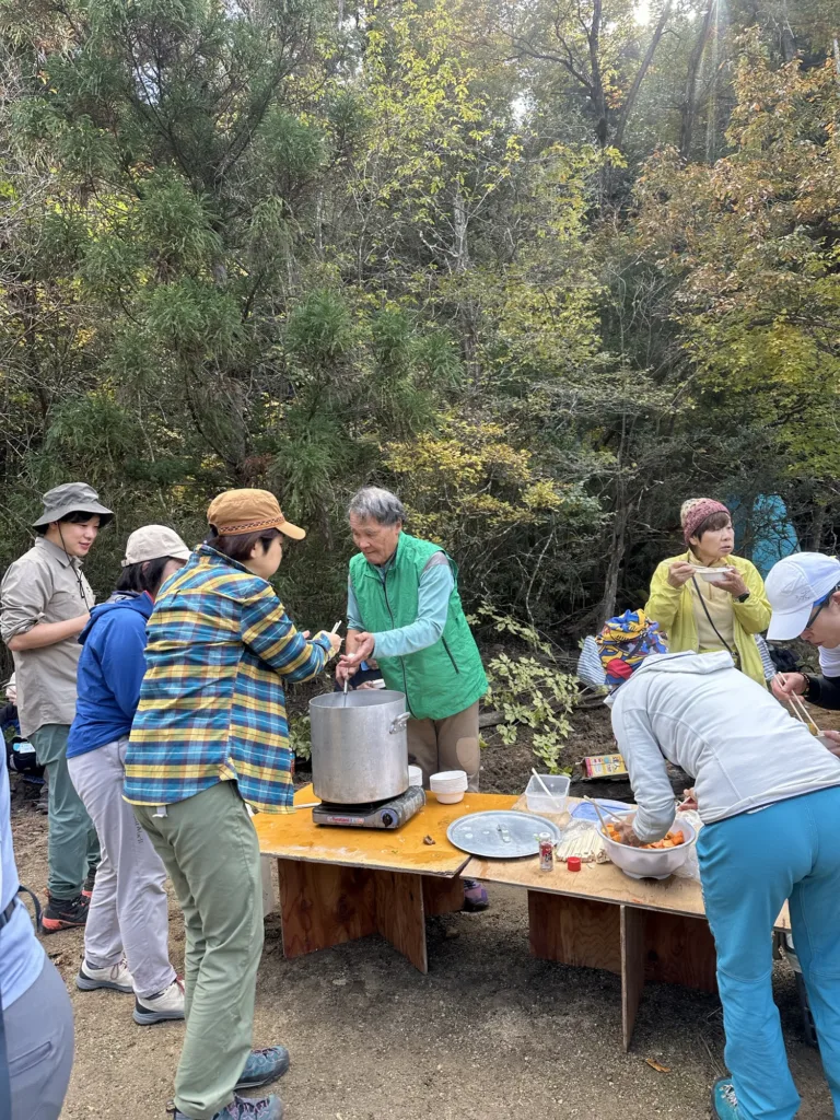 山中、”聖徳太子の古墳”という巨石に足を止め、石に触れたり「本当に⁈」と多くの班から声が上がった(笑)。真偽のほどは分からないが、物見山の名所である。山頂で集合写真を撮り下山。昼食は里山テラスハウスの手前の広場にて、猿投の森づくりの会のご厚意で猪汁と猿投で獲れた柿を提供してくださり、また仮設トイレを3機設置して、ゲストの皆さんに振舞ってくれた。