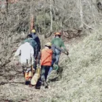 管理道を進み、崖の中腹の枯死木4本目を処理し、5本目は10m程の崖上にヤシャブシの枯死木が見られ、回り込んで崖上に登って頂き、足場の悪い中、伐倒処理を実施して頂いた。