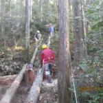 当日の実施方法は、選定した1本目は大き目のヒノキの木で、チェーンソーで受け口と追い口を入れ、参加者にメインの牽引ロープから分岐して儲けたロープを引いてもらい、人力で倒すというデモ伐採とする。人力でダメであればあらかじめセットしているプラロックで牽引する。2本目は小さ目の木で参加者に部分的にノコを入れてもら、1本目と同様に倒す。そのあと枝払いを体験してもらうこととする。