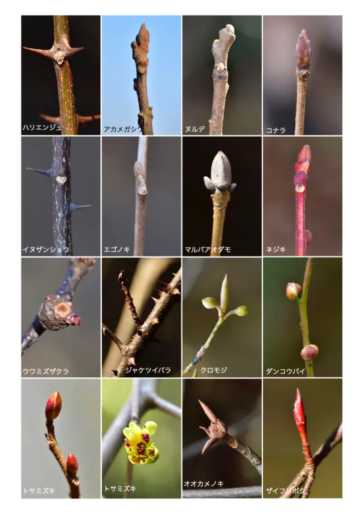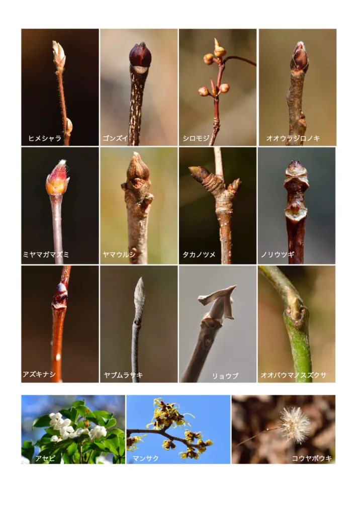 【冬芽】アカメガシワ、アズキナシ、アベマキ、イヌザンショウ、イボタノキ、イロハモミジ、ウグイスカグラ、ウスノキ、ウリカエデ、ウワミズザクラ、エゴノキ、オオウラジロノキ、オオカメノキ、オオバウマノスズクサ、オオバヤシャブシ、カスミザクラ、カマツカ、クサギ、クロモジ、コアジサイ、コウヤボウキ、コゴメウツギ、コツクバネウツギ、コナラ、コバノガマズミ、コバノミツバツツジ、コブシ、ゴンズイ、ザイフリボク、サルトリイバラ、シロモジ、ジャケツイバラ、シラキ、スイカズラ、タカノツメ、タニウツギ、ダンコウバイ、ツクバネウツギ、トサミズキ、ナツツバキ、ナツハゼ、ニガイチゴ、ニシキギ、ヌルデ、ネジキ、ノイバラ、ノリウツギ、バイカツツジ、ハリエンジュ、ヒメシャラ、ヒメヤシャブシ、マルバアオダモ、マンサク、ミヤコイバラ、ミヤマガマズミ、ムラサキシキブ、ヤブムラサキ、ヤマアジサイ、ヤマウグイスカグラ、ヤマウルシ、ヤマコウバシ、ヤマツツジ、ヤマハゼ、リョウブ